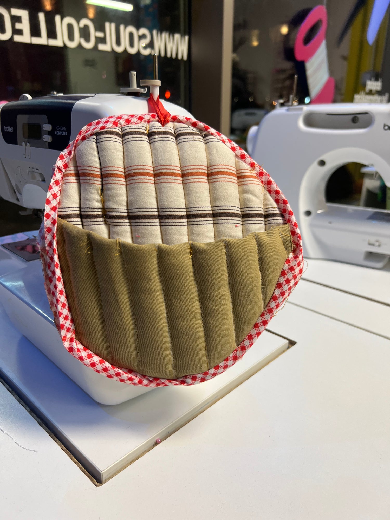 Students learn the basics of how to sew in Beginners Sewing Classes getting familiar with the parts of the machine and its function to Threading the machine to following the seam allowances bringing in focus, eye, hand and foot coordination, and learn how to sew the project of the month along with their own creative box pin cushion. Fabric is included and use of the sewing machines. Unfortunately, there are no hours for make up classes if you miss a class. There is nothing else to bring other than your happy learning energy 😃. And if you have your own machine and would like to learn on it, please feel free to bring it to class.