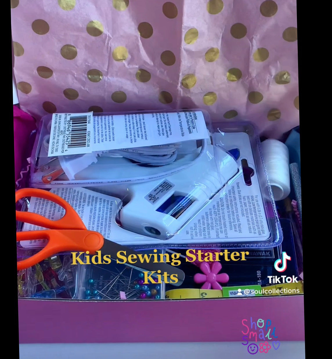Tracing Paper for Fabric, Tracing Wheel, Sewing Guage, Tape Measure, Seam Ripper, 1 Spool of Thread, Needle Threader, Tailors Chalk, Embroidery Needle, Embroidery Thread, Box of 25 Craft Pins, Box of 18 Sewing Clips, Kids Scissors, Buttons, 3 Hot Glue Sticks, Hot Glue Gun, 1 Surprise Hand-Sewing Project, Small bag of Polyfil and a Gifted Scented Satchet Pin Cushion.